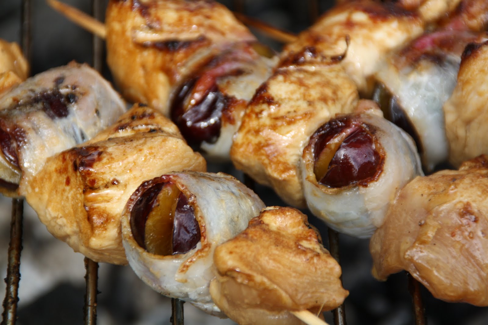 Pierś oczyścić i pokroić w kostkę ok 3x3 cm. Wymieszać sos sojowy, musztardę, olej, sok z cytryny, imbir i pieprz i zamarynować mięso na około 2-3h. Śliwki wypestkować, ale nie rozdzielać ich do końca. Plastry boczku przekroić na pół, w każdy kawałek zawinąć śliwkę. Nadziewać na zwilżone wodą patyczki naprzemiennie kurczaka i owinięte boczkiem śliwki. Grillujemy aż się zarumieni. Można oczywiście również na patelni grillowej lub w piekarniku. Pyszne są!