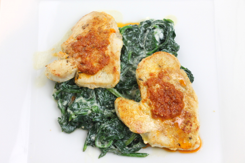 Pyszne,proste, szybkie i zdrowe danie. Może nawet trochę wykwintne. Sznycle z indyka z czerwonym pesto podane na duszonym szpinaku z dodatkiem serka ricotta. Danie lekkie, wartościowe i naprawdę bardzo, bardzo smaczne.