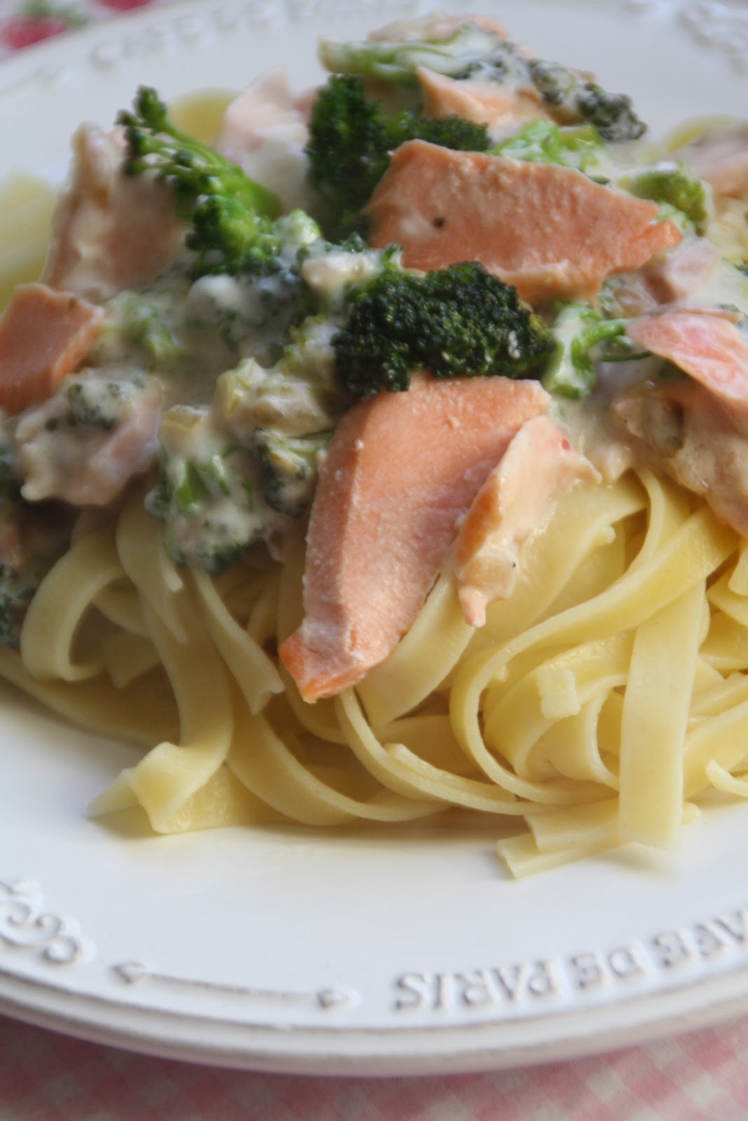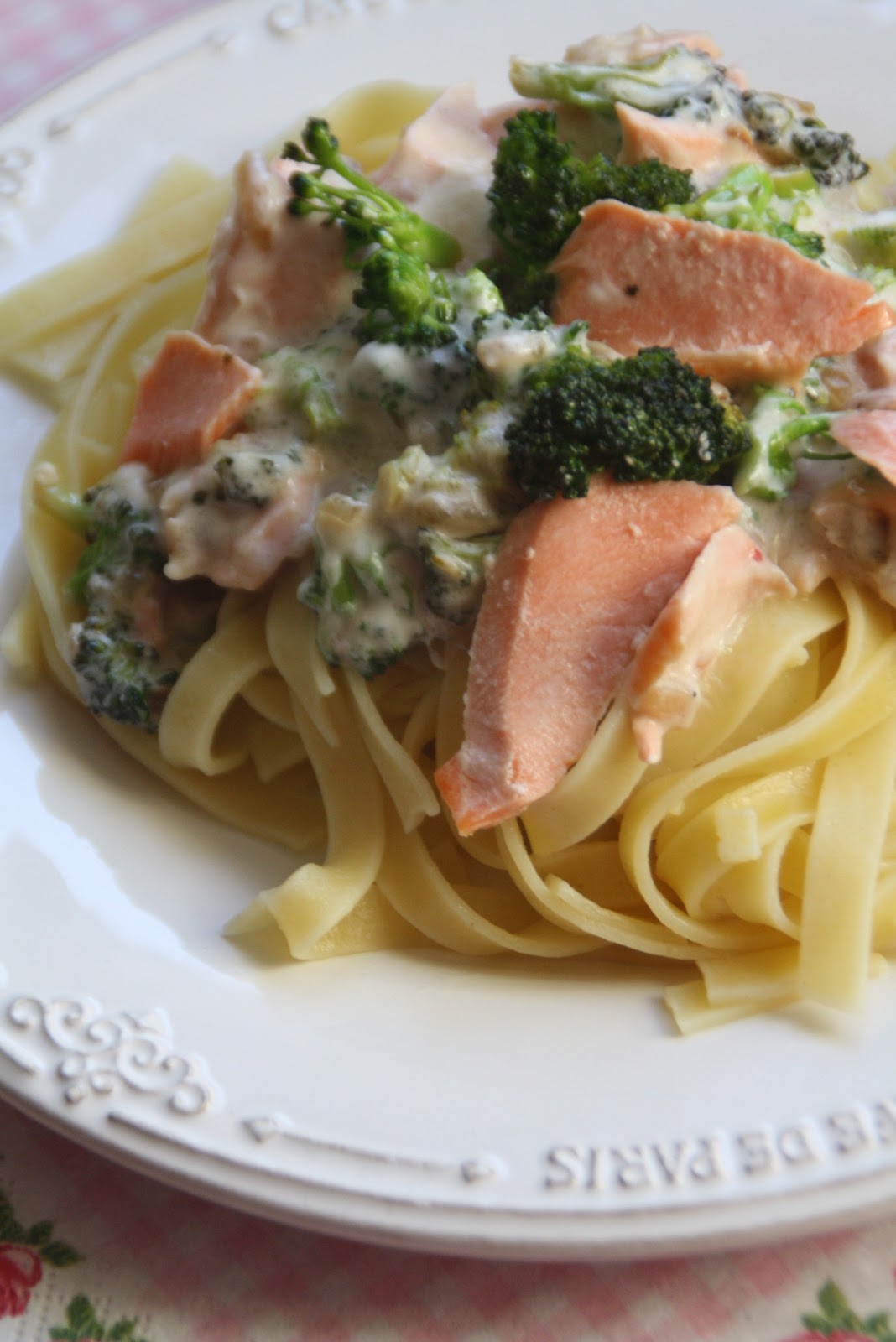 Tagliatelle z łososiem i brokułami w śmietanowym sosie