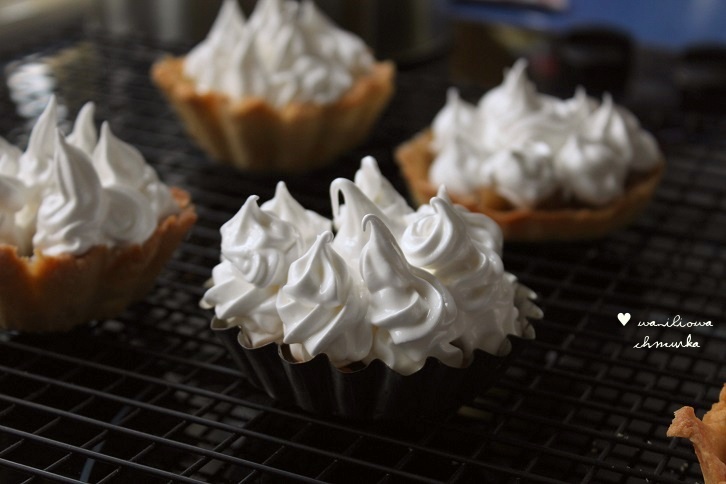 beza włoska: - 3 białka - 170 g cukru kryształu Mąkę wsypać do miski, dodać pokrojone w kostkę zimne masło, cukier, jajko, sól, ekstrakt. Zagnieść ciasto, zawinąć w folię spożywczą i włożyć na 1- 2 godziny do zamrażalnika. Po tym czasie wyjąć ciasto, rozwałkować na prostokąt o grubości ok. 1,5 cm. Wysmarować foremki lub dużą formę o średnicy 26 cm masłem i posypać bułką tartą, wylepić kruchym ciastem. Zrobić w każdej babeczce dziurki widelcem- dzięki temu nie uwypuklą się podczas pieczenia. Rozgrzewam piekarnik do 180 stopni C. i piekę spody tart lub spód jednej tarty na złoty- około 25 minut. Po tym czasie przekładam je na kratkę do studzenia ciasta. Gdy ostygną, wyjmujemy z foremek i przekładamy na tacę. Łodygi rabarbaru obieram, kroję w kostkę, przekładam do rondelka i zasypuję cukrem. Podgrzewam na średnim ogniu, stale mieszając do uzyskania konsystencji musu. Gdy takową osiągnę, wyłączam ogień i zestawiam rondel na bok. Gdy mus przestygnie wypełniamy nim spody tartaletek. Przygotowuję bezę: do miski wkładam oddzielone białka i ubijamy je. Cukier mieszamy w rondelku, dolewamy 40 ml wody i podgrzewamy na wolnym ogniu. Gotujemy syrop, jest gotowy gdy kropla upuszczona do zimnej wody, tworzy kuleczkę. Zdejmujemy z ognia, odstawiamy do momentu, aż przestanie się gotować. Gorący syrop wlewamy cienkim strumieniem powolutku do białek, cały czas miksując do momentu aż białka staną się białe i lśniące. Po dodaniu całości syropu, białka ubijamy jeszcze 12 minut. Muszą trochę ostygnąć. Ubitą bezę przekładamy do rękawa cukierniczego i wyciskamy na tartaletki.