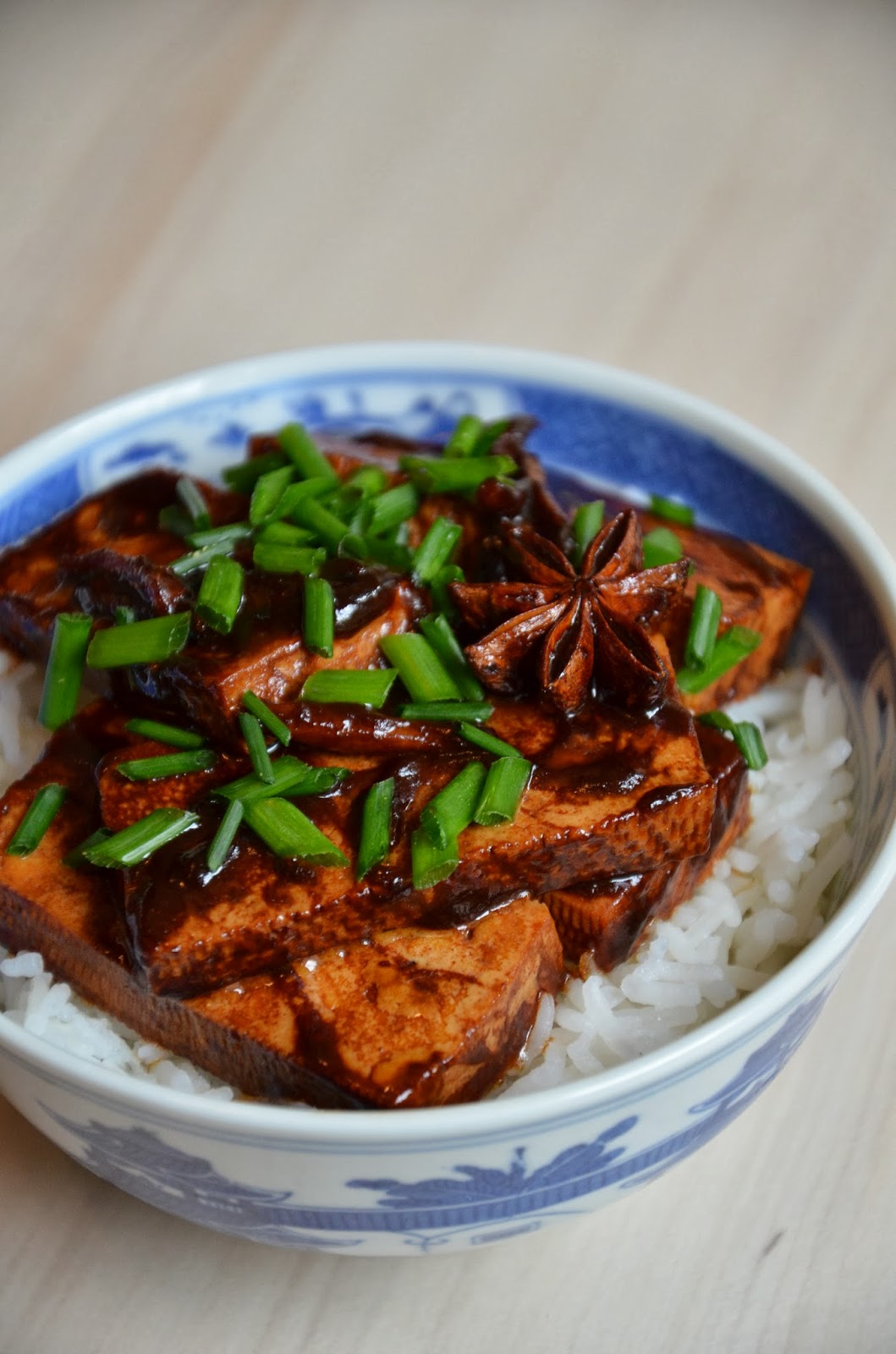 Tofu z sosem z winem shaoxing, z imbirem i anyżem gwiazdkowym chyba stanie się jednym z moich ulubionych dań. To prawda, że może nie jestem obiektywna, bo bardzo lubię całą azjatycką kuchnię, ale akurat ta propozycja spośród jej przepisów ostatnio wypróbowanych przeze mnie zdecydowanie się wyróżnia. Smakiem, bogatym aromatem i tym, że jedząc, można myślami przenieść się na Daleki Wschód, tak przynajmniej usłyszałam;) W dodatku obiad jest gotowy w kwadrans. Polecam!