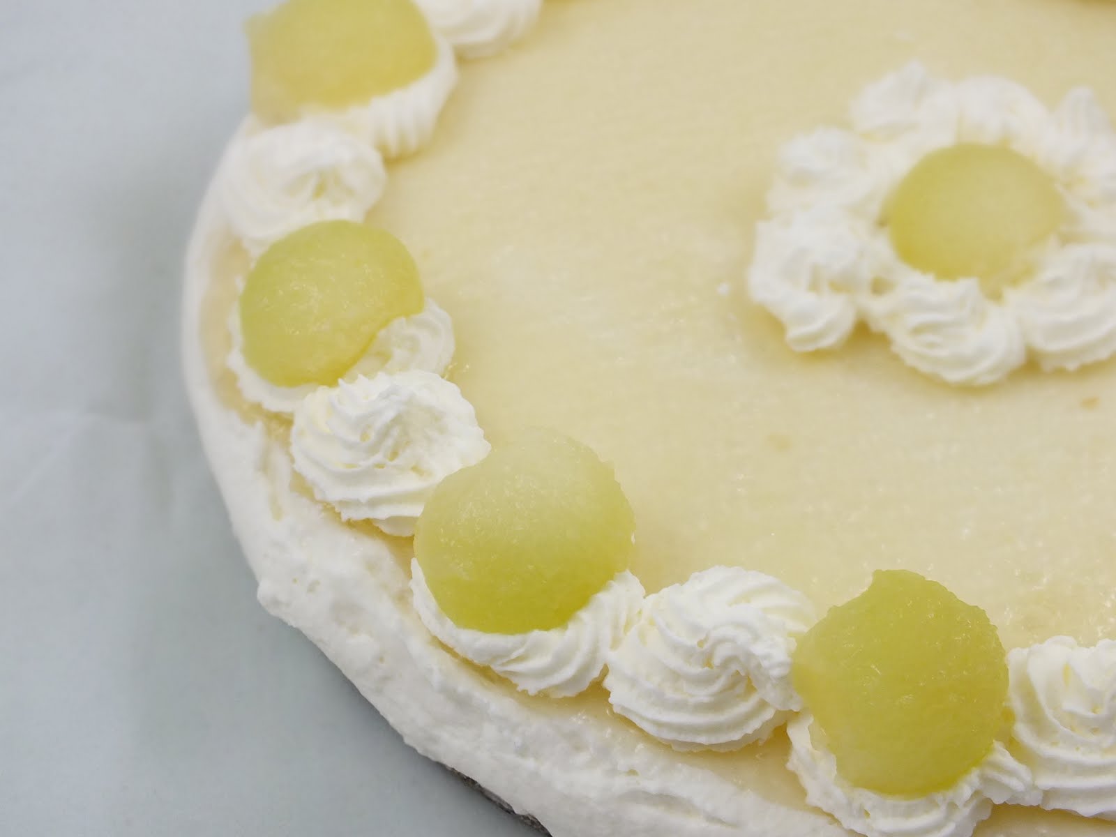 Gdy tort stężeje ubić śmietankę z cukrem pudrem i dekorować tort. Ja wyciskałam śmietanę za pomocą szprycy. Na torcie ułożyć wydrążone kulki melona.