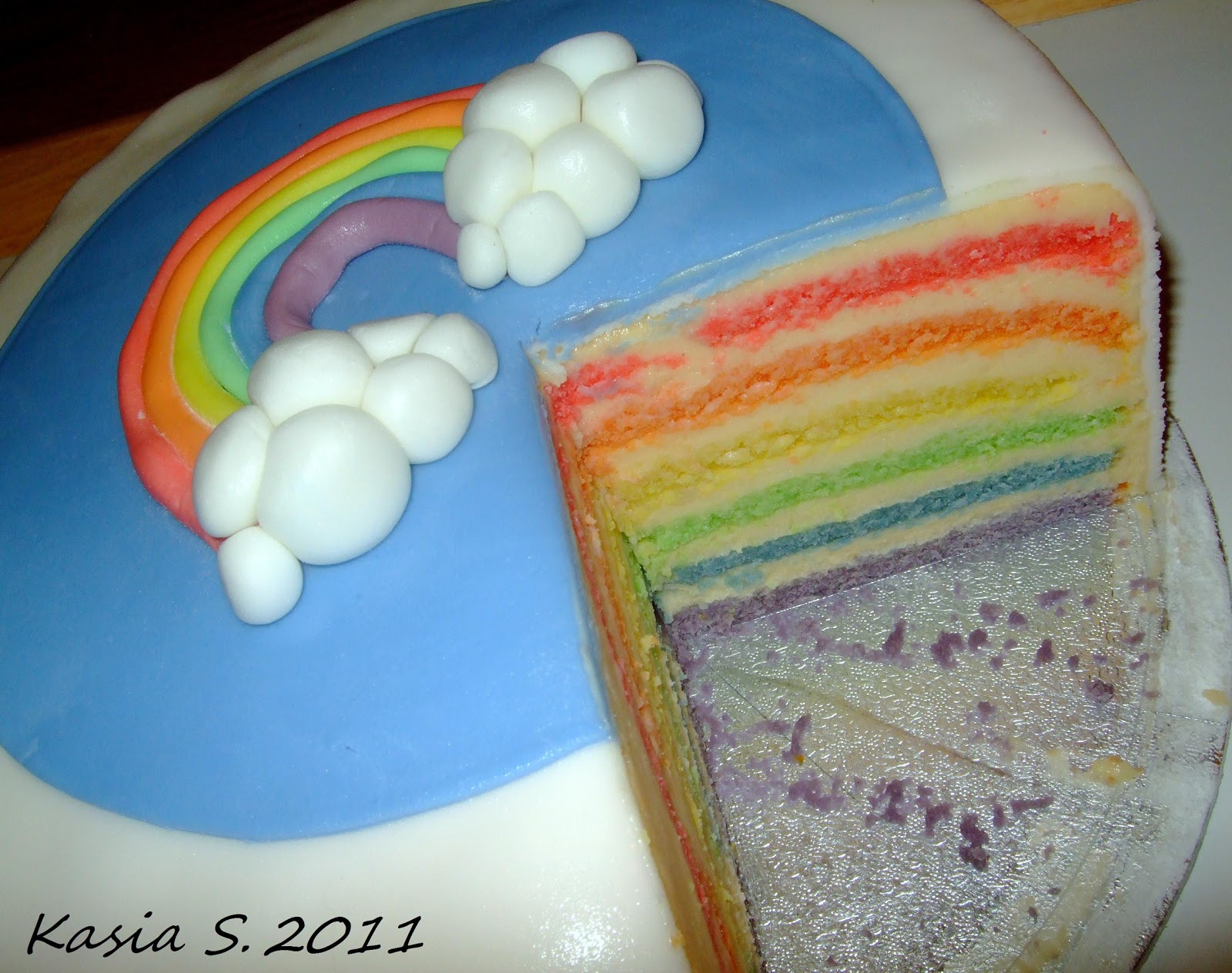 Pomijając walory smakowe, które nie są powalające (tort jest po prostu smaczny i to wszystko), zachwyca swoim wyglądem, nie tylko dzieci. Kawałeczek takiego smakołyku wniósł bardzo dużo uśmiechu i pozytywnej energii w szarawą jesienną rzeczywistość osób dorosłych zamieszkujących w moim domu.Idealny dla wszystkich, nie tylko na urodziny, idealny bez okazji...:) Tort tęczowy*:Ciasto (6 blatów)
