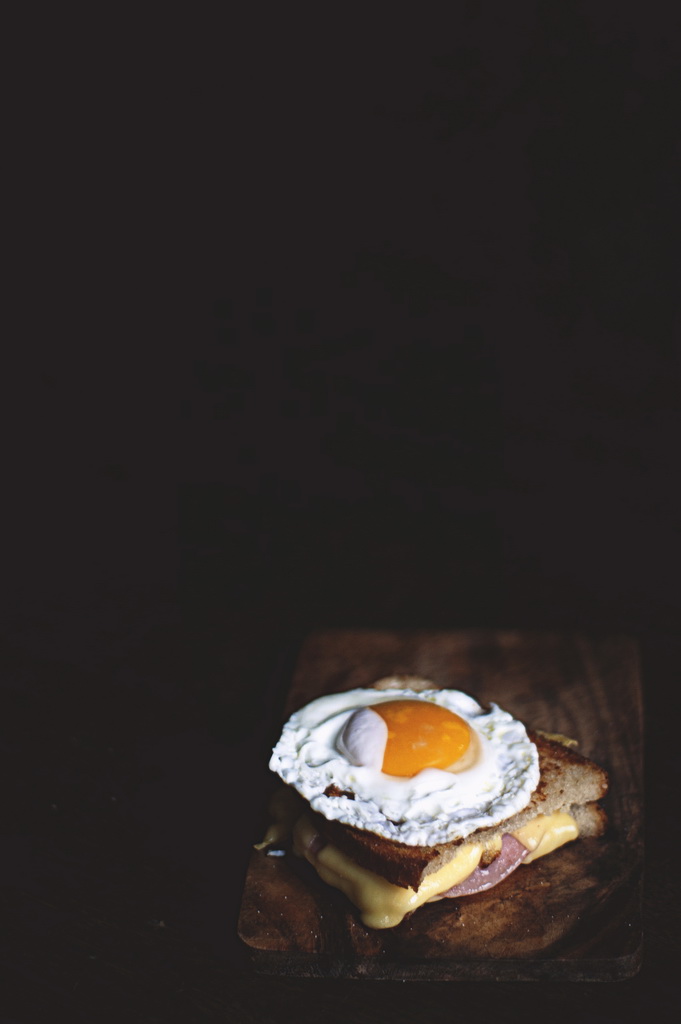 Zacząć trzeba od usmażenia jajka. Warto sobie ułatwić życie i zrobić to z wykorzystaniem silikonowej obrączki, dzięki temu jajko nie rozleje nam się po całej patelni i będzie je można zmieścić w całości bez przycinania na gotowej kanapce. Jeśli takiej nie macie, będziecie musieli chwilę pokombinować po usmażeniu. Jajko musi być usmażone oczywiście w taki sposób, żeby białko się ścięło, a żółtko wprost przeciwnie. Gotowe jajko zdejmujemy z patelni i zamiast niego wkładamy kanapkę przełożoną na przemian serem, szynką i znowu serem. Zapiekamy z obu stron, tak żeby ser się rozpuścił i stał ciągnący. Trwa to chwilkę na tyle krótką, że jajko nie zdąży w tym czasie wystygnąć. Kiedy ser zaczyna wypływać spomiędzy kromek chleba, zdejmujemy kanapkę na talerz, na wierchu kładziemy jajko i patrzymy na wytrzeszczone oczy reszty domowników...
