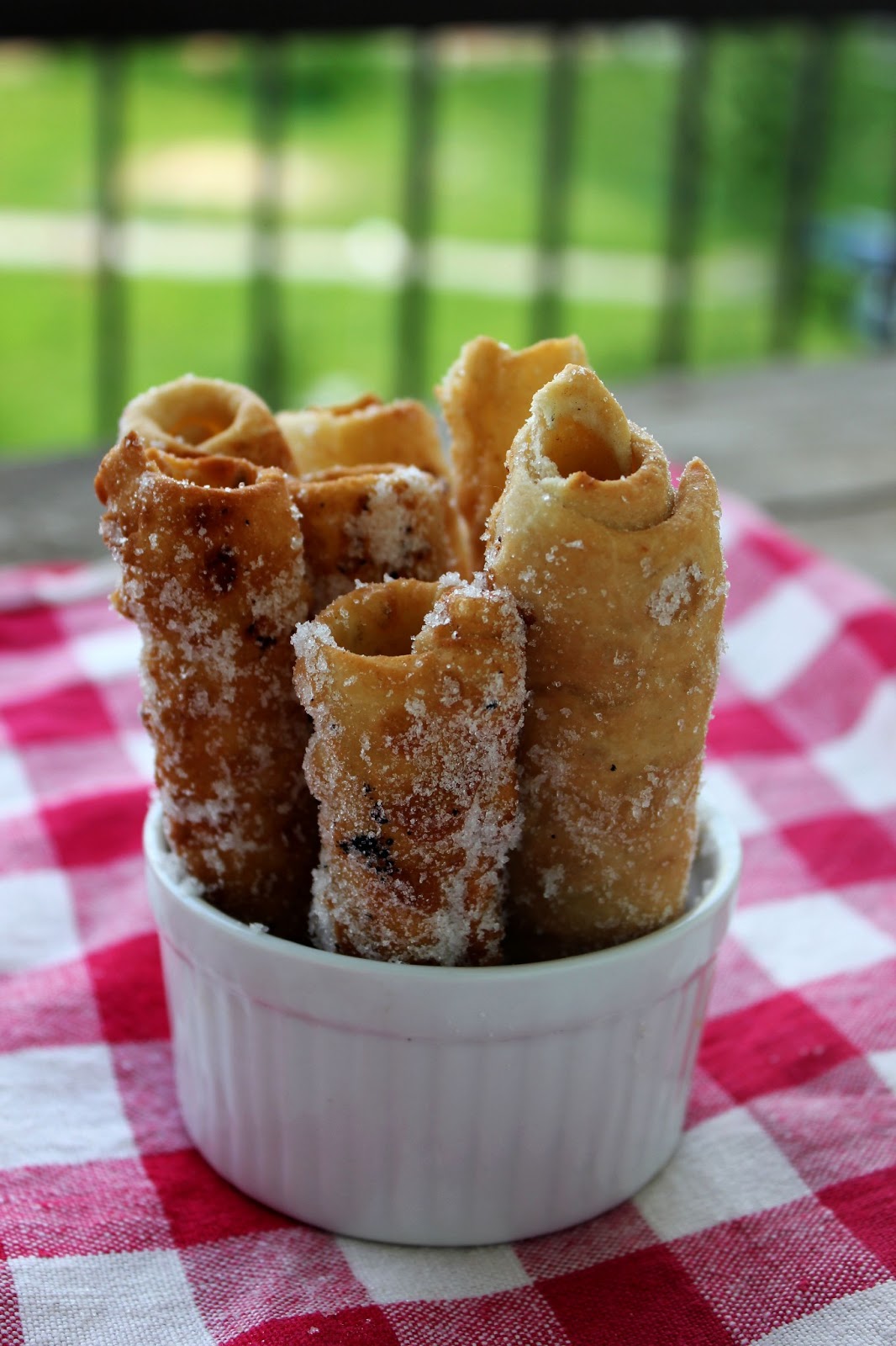 - Smażyć chwilę z wszystkich stron do zarumienienia, następnie na ręczniku papierowym odsączyć z nadmiaru tłuszczu, a później obtaczać jeszcze ciepłe rurki w cukrze.