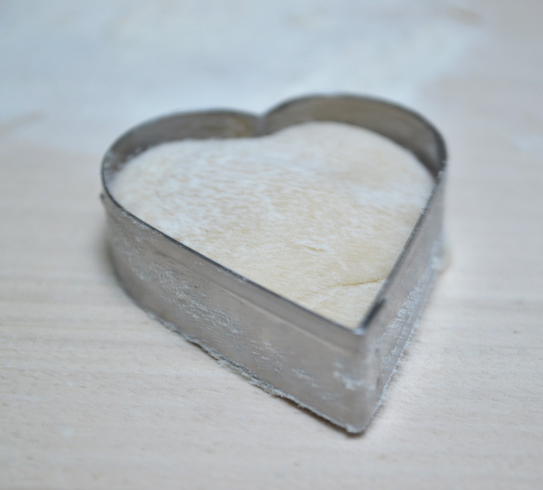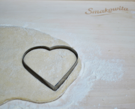 - Rozwałkowujemy ciasto na grubość 1-1,5 cm. Z foremek wykrawamy serduszka (lub szklanką kółka). Przekładamy je na blaszkę wyłożoną pergaminem.