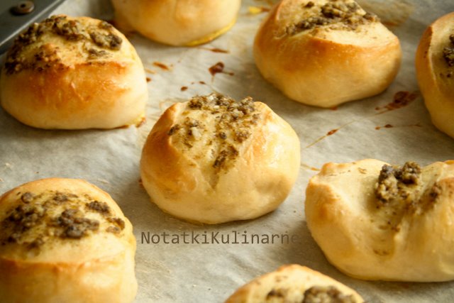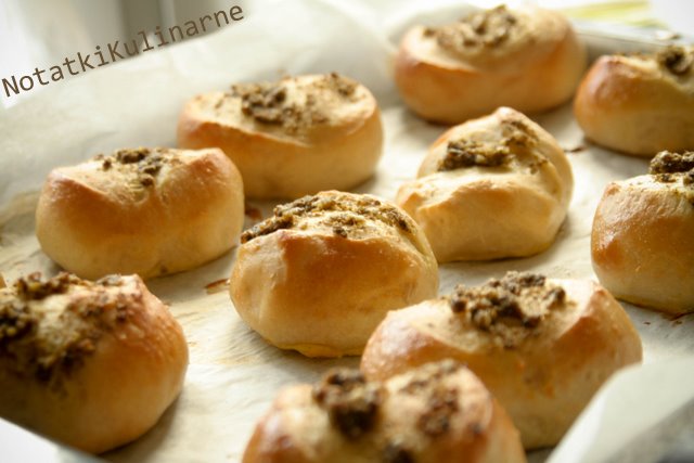 Przygotowanie: Wszystkie składniki na ciasto wrzucić na stolnicę lub do miski i wyrobić (z drożdży świeżych najpierw zrobić rozczyn). Ciasto powinno być gładkie i bardzo dobrze wyrobione. Umieścić w misce, przykryć lnianym ręczniczkiem i pozostawić do podwojenia objętości (1,5 h lub dłużej, w zależności od temperatury otoczenia). Po tym czasie ciasto podzielić na 12 równych części. Uformować z nich kulki, następnie każdą spłaszczyć i ulepić w podłużną bułeczkę (tak, jak lepicie pierożki), układając złączeniem do blachy. Przykryć, pozostawić na 30 minut do ponownego wyrośnięcia w ciepłym miejscu.