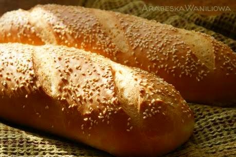 Przygotowane chlebki posmarować białkiem roztrzepanym z wodą i grubo posypać sezamem. Ostrym nożem zrobić po 3 ukośne nacięcia na każdym bochenku. Wstawić do nagrzanego do 200 st.C piekarnika na ok. 25 minut.