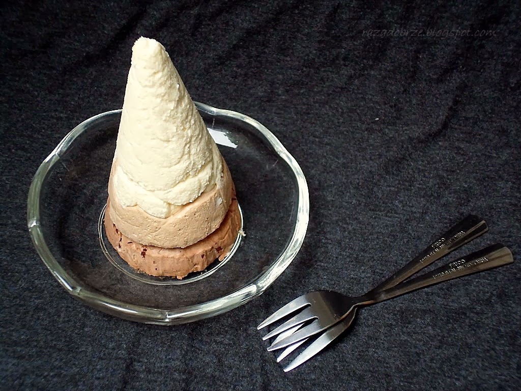 Jedna rzecz - rozmiar. Nie ma szans, żeby wcisnąć w siebie całego takiego rożka po obiedzie. A i po dłuższej przerwie może być ciężko - tyle czekolady potrafi nasycić... I choć deser jest naprawdę lekki, to jednak sycący. Można więc zrobić dwanaście mini rożków, jeśli ktoś ma cierpliwość. Albo przygotować deser w szklankach lub małej tortownicy - będzie prościej. Choć już z pewnością nie tak widowiskowo...