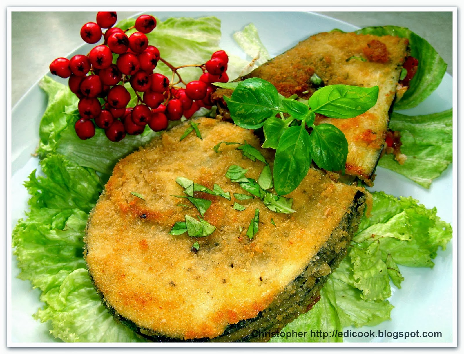 Nazwa trochę przewrotna, ale danie pyszne. Wynalazki, dlatego, że pomiędzy dwa plastry bakłażana i ser, można włożyć np. szynkę konserwową i pomidora w plastrach czy też np. plasterki świeżego ogórka. Pełna dowolność. Podajemy jako samodzielne danie lub jako przystawkę. Wszystko zależy od naszych "mocy przerobowych".