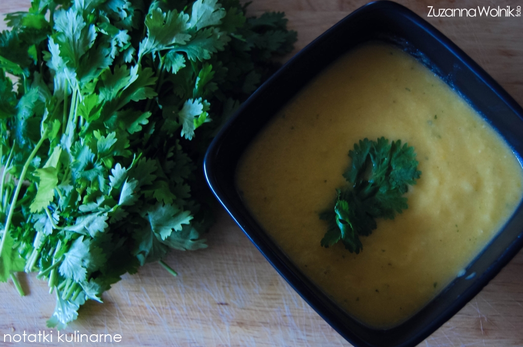 Przypraw solą i pieprzem i za pomocą blendera zmiksuj zupę - podawaj z liścmi kolendry.