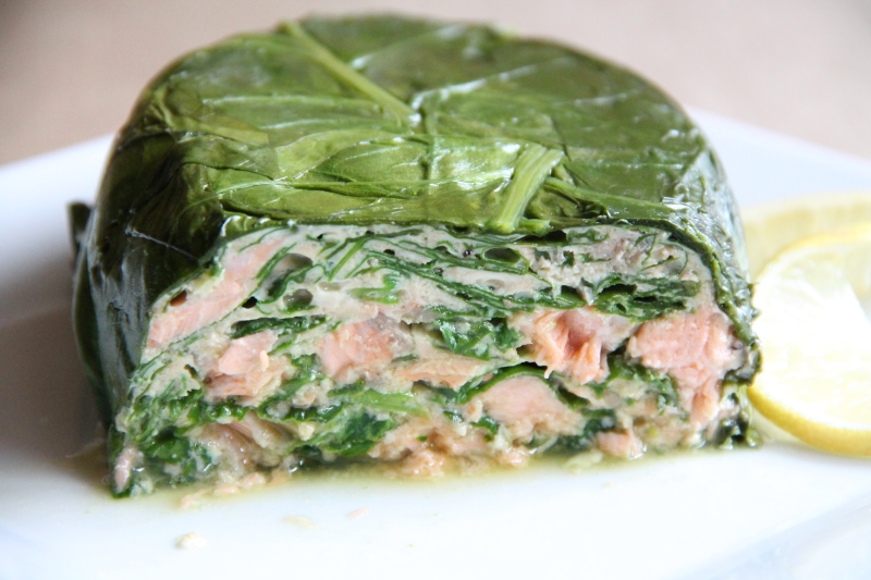 Zapiekanka z łososia w liściach szpinaku