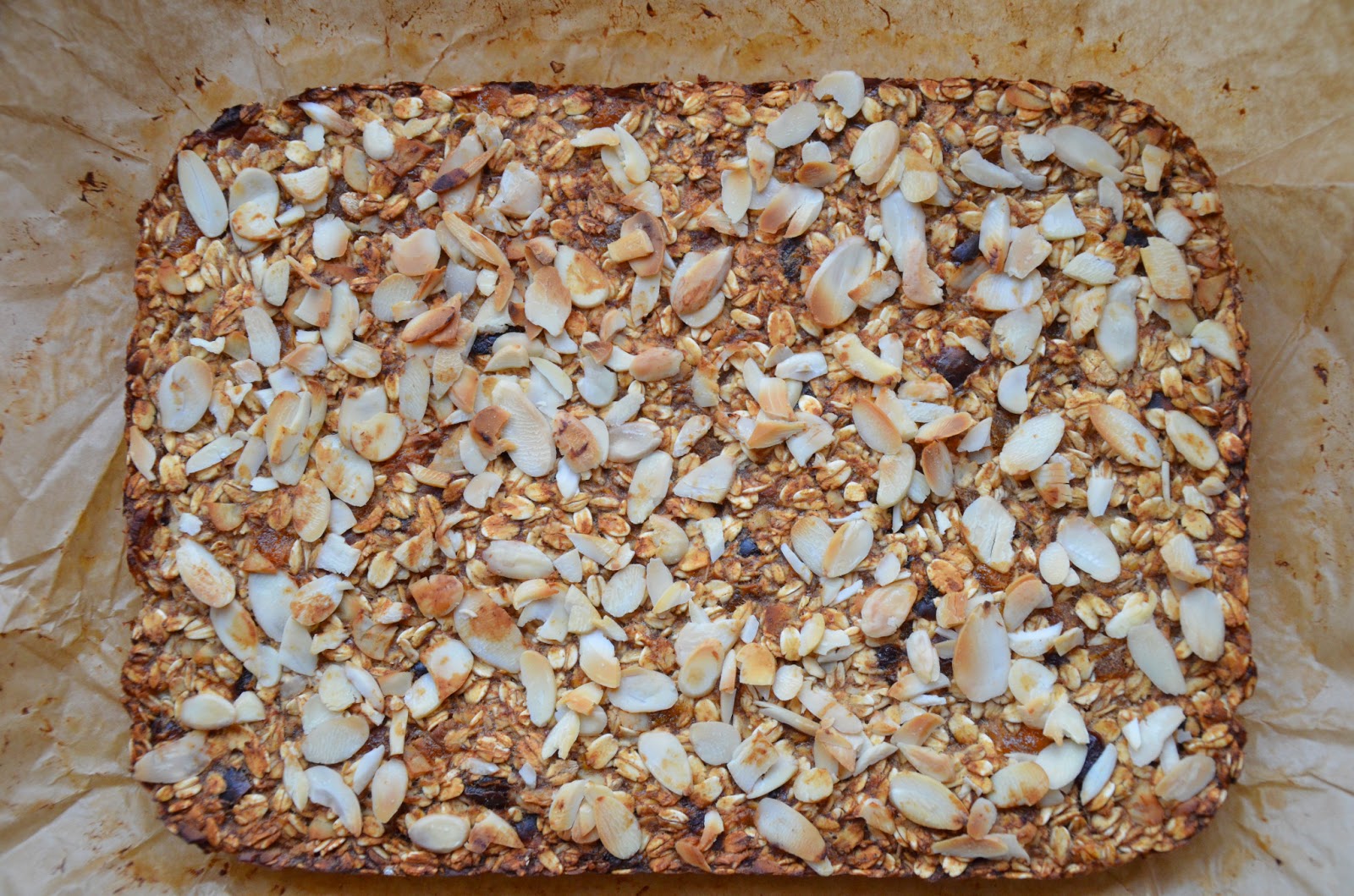 Jak zwykle konieczność wykorzystania bardzo dojrzałych bananów poskutkowała znalezieniem kolejnego ciekawego przepisu;) I to bardzo ciekawego - na pyszne batoniki z płatków owsianych, słodkie dzięki bananom, suszonym morelom i daktylom, z chrupiącymi migdałami w płatkach. Nie zawierają dodatku tłuszczu ani cukru, a mimo tego smakują świetnie! Poza tym nie obawiajcie się, że same banany nie skleją wszystkich składników. A jeśli wolicie, by były słodsze, możecie dodać więcej daktyli lub innych owoców. Dla mnie były w sam raz, idealne na przekąskę do zabrania albo na śniadanie. Na pewno jeszcze poeksperymentuję z tym przepisem, bo może być bazą dla innych połączeń smakowych.
