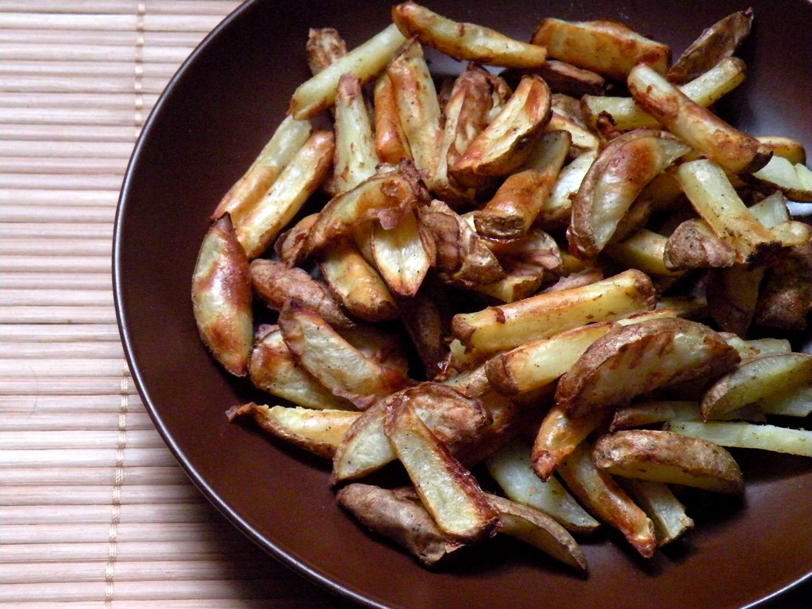 Ziemniaki myjemy, dokładnie szorujemy (nie obierając) i kroimy w cienkie słupki. Mieszamy z białkiem, sosem sojowym i przyprawami. Przekładamy na blachę wyłożoną papierem do pieczenia (najlepiej żeby kawałki ziemniaków nie leżały na sobie i nie przylegały zbyt ściśle do siebie). Pieczemy 40 minut w temperaturze 200 stopni (po 10-15 minutach białko się zetnie i ziemniak przylepią się do papieru - wystarczy podważyć je łopatką i przewrócić na drugą stronę).