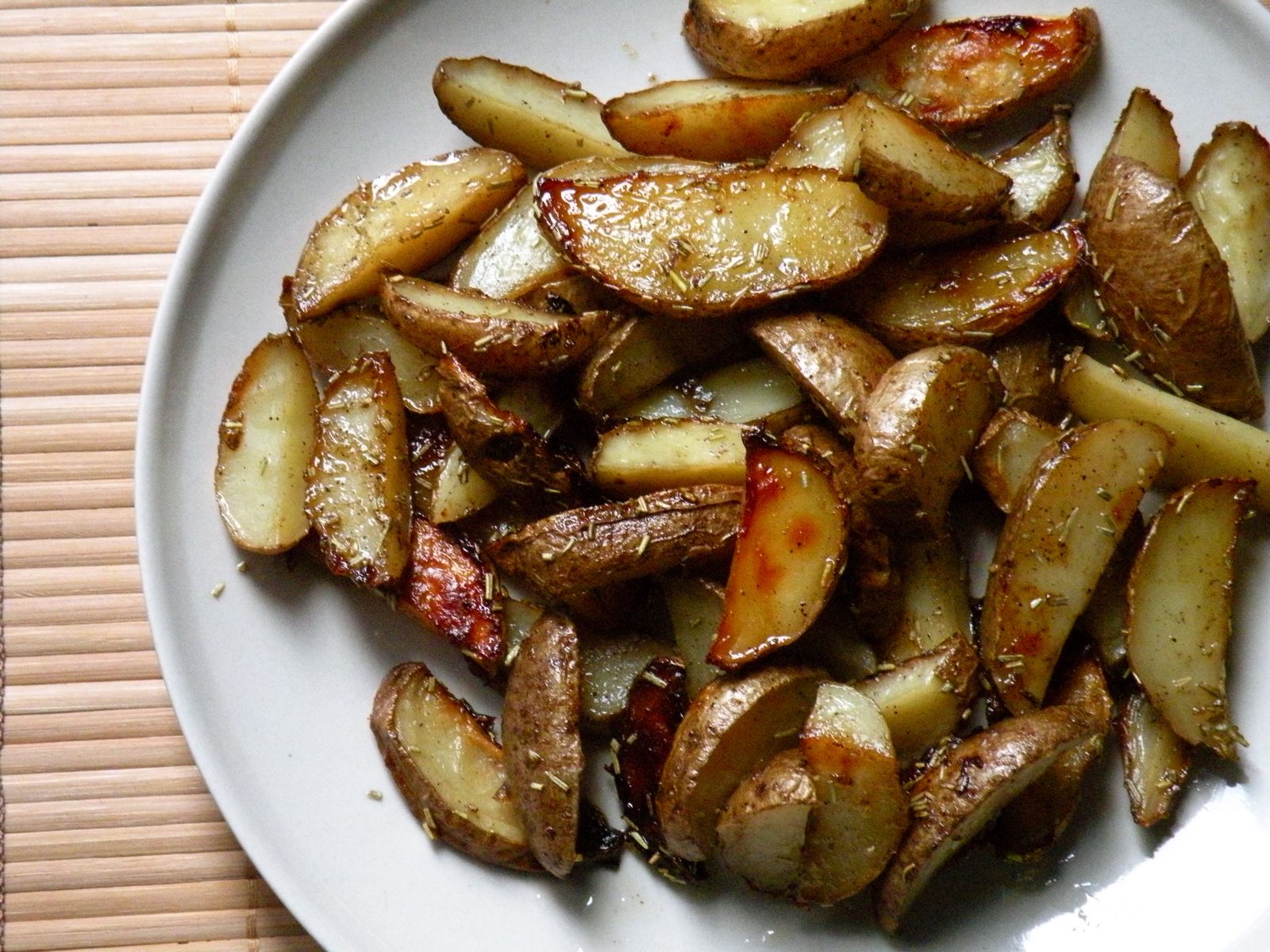 Ziemniaki myjemy, dokładnie szorujemy (nie obierając) i kroimy w ćwiartki. Mieszamy z drobno posiekanym rozmarynem, oliwą, syropem klonowym, solą i pieprzem, przekładamy do naczynia żaoodpornego [u mnie blacha wyłożona papierem do pieczenia]. Pieczemy 45 minut w temperaturze 180 stopni, a przez ostatnie 10 minut - w 200 stopniach, aby ziemniaki ładnie się zarumieniły.