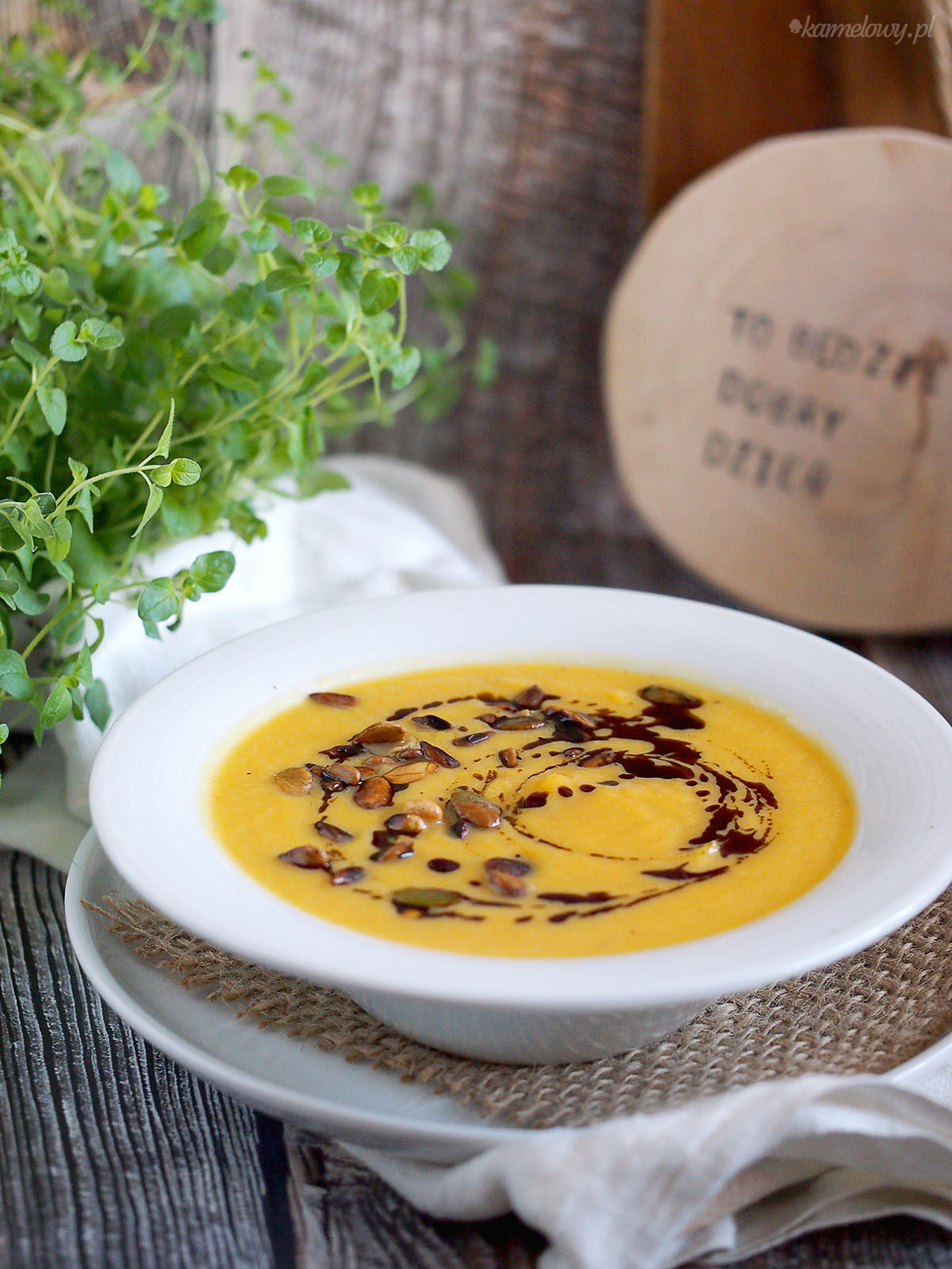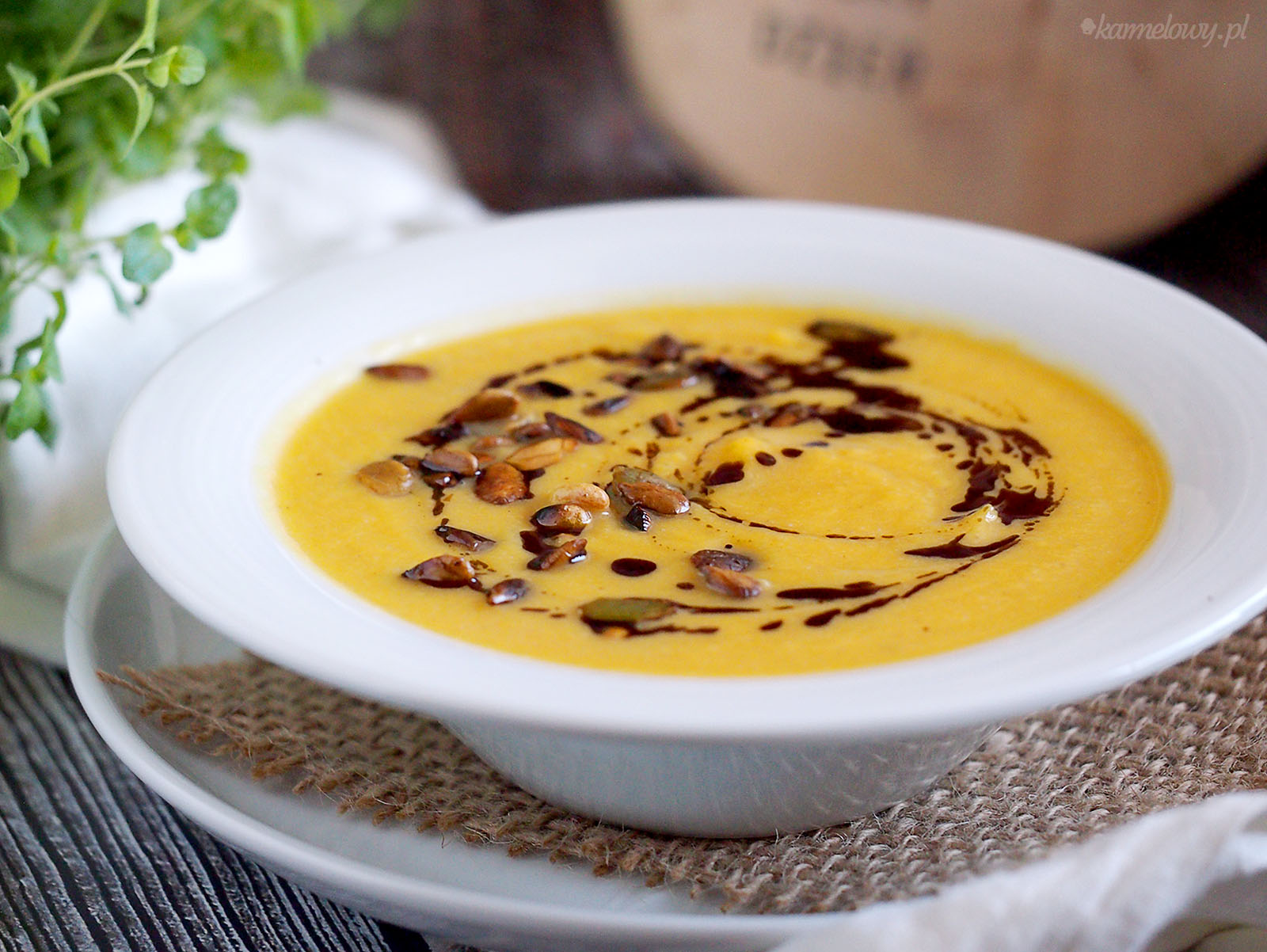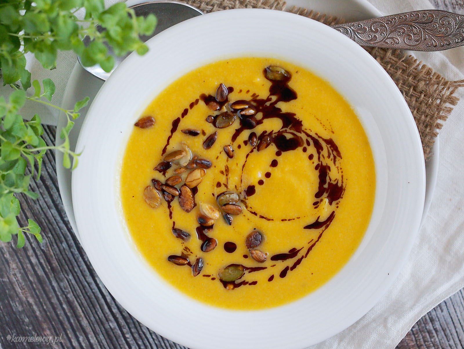 - Podawaj zupę skropioną olejem dyniowym i uprażonymi pestkami.