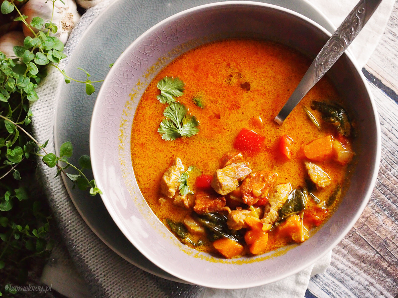Wraz z chłodnymi dniami nadszedł czas na rozgrzewające zupy z dynią w roli głównej. Tym razem proponuję bardzo rozgrzewającą i sycącą zupę z dynią, papryką i szpinakiem z dodatkiem chorizo i polędwiczki wieprzowej. Zupa ta jest gęsta i bardzo pożywna, a ze względu na szybkie przygotowanie jest też idealna na obiad w tygodniu. Ponadto dzięki chorizo nabiera też charakteru i pikanterii co także jest wskazane na chłodne dni, jednak bez problemu można je zastąpić naszą swojską kiełbaską. Polecam gorąco!