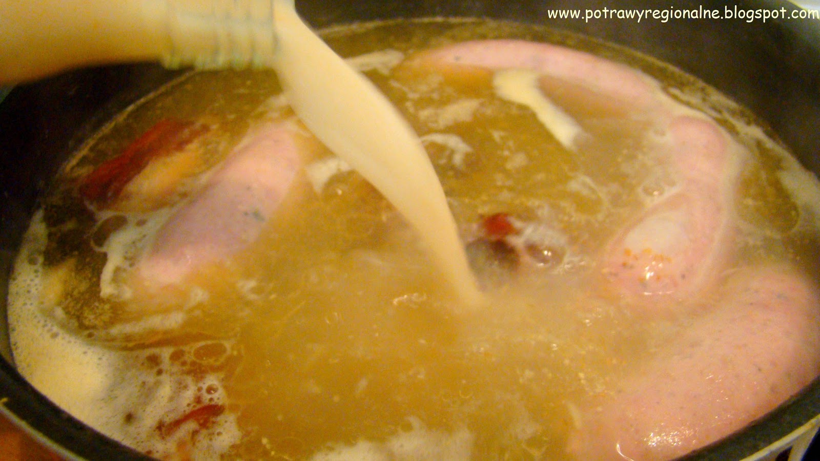 Następnie ugotowaną kiełbasę,pokroiłam w plasterki i włożyłam do zupy.